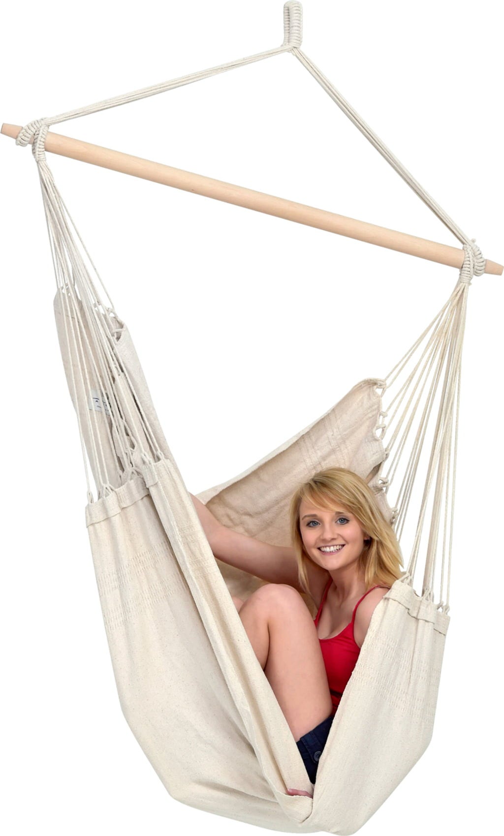 Thanks to the numerous suspension cords, your weight is evenly distributed so you can experience a wonderful feeling of weightlessness. A beechwood spreader bar provides the necessary stability. To ensure that the cords stay in place, the wooden bar has practical notches on the ends that prevent them from slipping out of place. The extra-thick cords and hand-woven, 5-fold sewn eyelets make the hanging chair particularly robust and durable. The extra-dense 400 g/m² fabric can easily hold up to 150 kg.