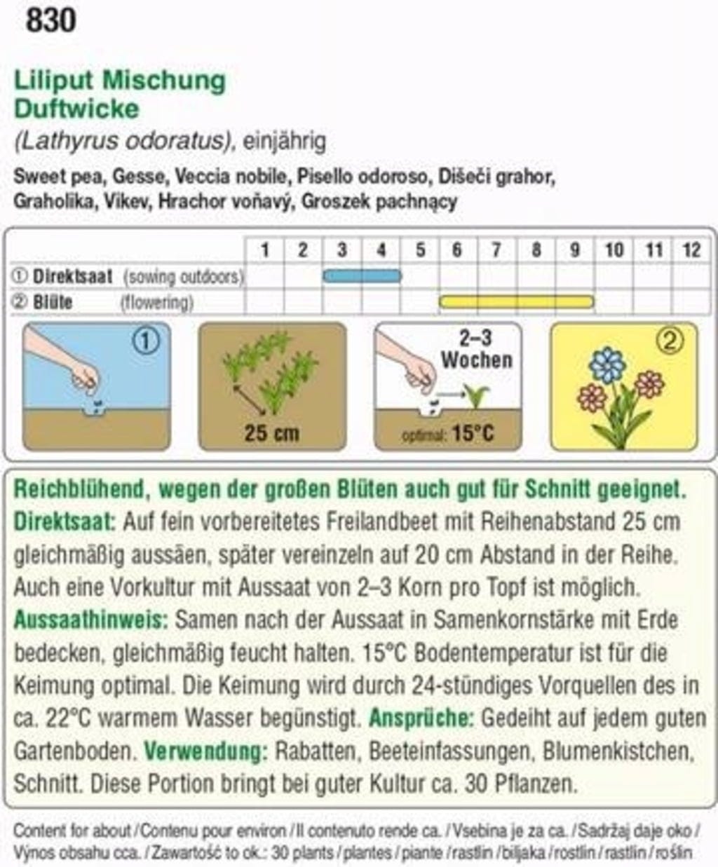 The Sweet Pea "Liliput Mix" is characterized by its rich floral abundance, making it excellent for cut flowers. This variety grows low and does not climb. An excellent choice for borders, edging, pots, and balcony boxes.