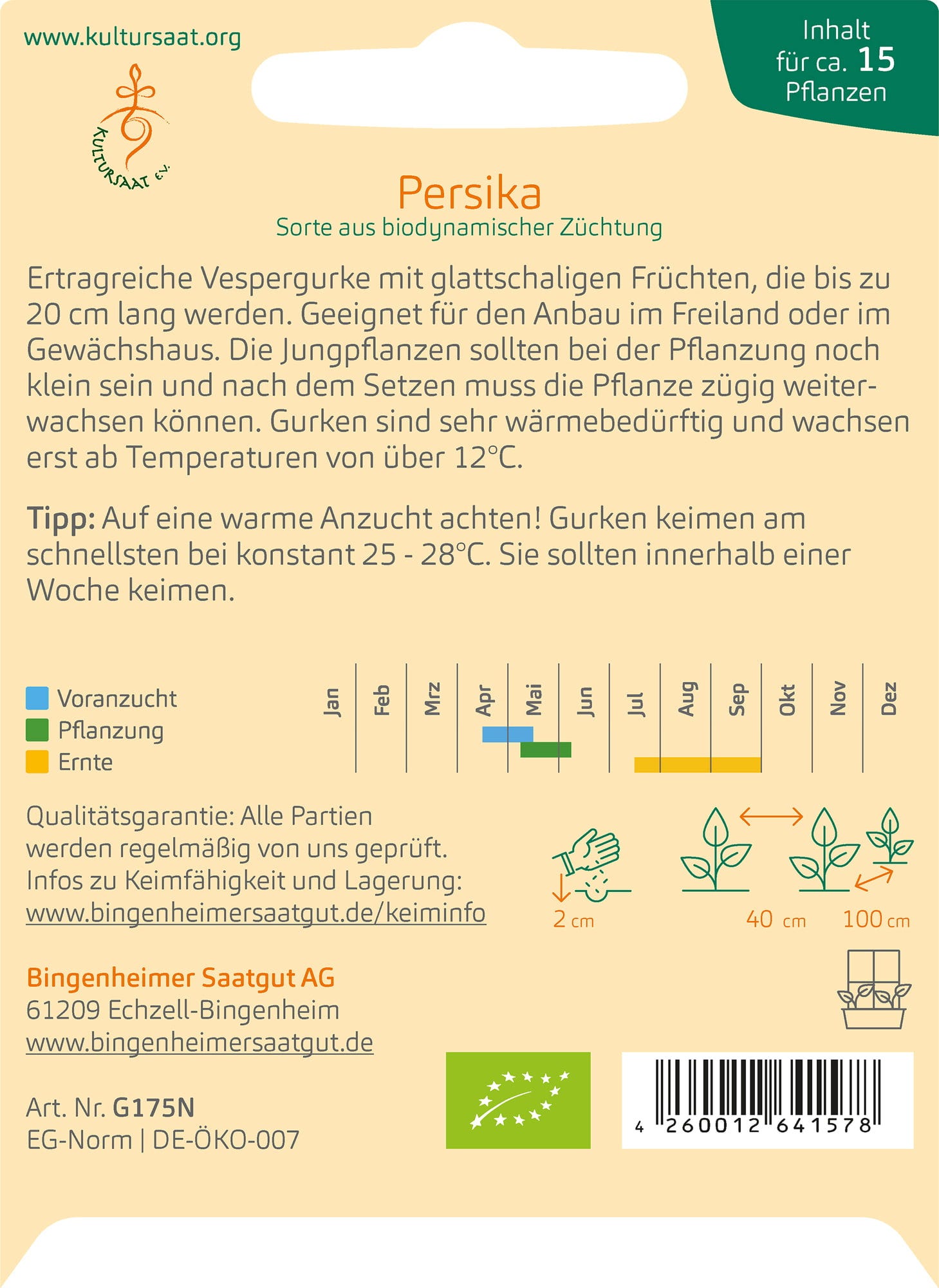 The 'Persika' outdoor cucumber offers an exceptional flavour and is largely bitter-free. Thanks to its crisp, crunchy texture, it is also well-suited for pickling. The medium-long green fruits have a smooth skin and typically reach a length of about 20 cm.