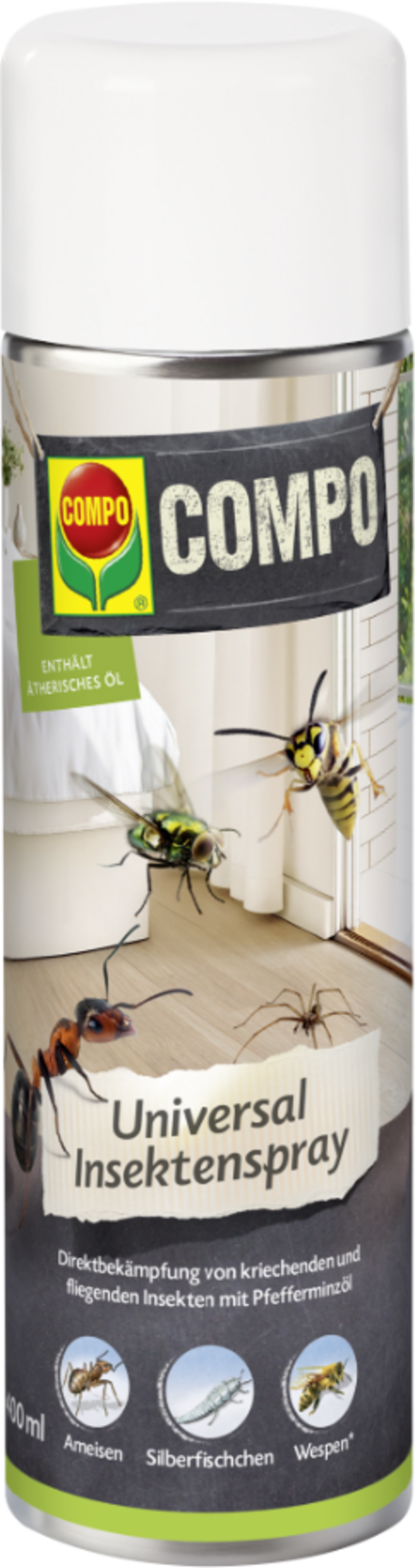 COMPO Universal Insect Spray is an effective choice for the direct control of ants, silverfish, spiders, mosquitoes, wasps, flies and other insects. Its peppermint oil-based formulation acts precisely, has a pleasant scent and enables accurate application thanks to the innovative spray system. Ideal for living areas, cellars, kitchens and other indoor spaces where insects need to be controlled effectively and discreetly.
