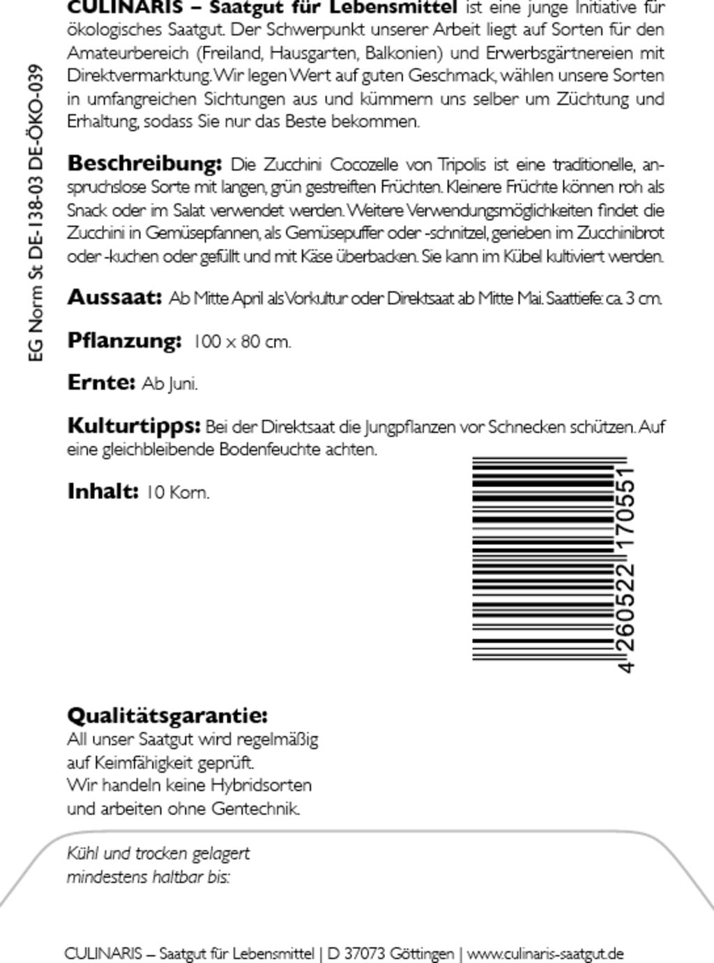 Culinaris Organic Zucchini "Cocozelle von Tripoli", 10 Seeds