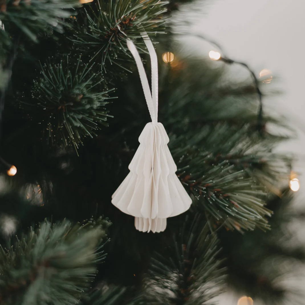 Set natural, festive accents with the fir tree paper pendants. The delicate fir trees in a honeycomb look decorate Christmas trees, branches, gifts or windowsills.