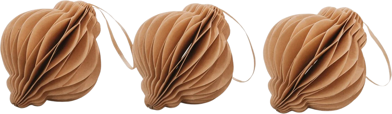 The paper pendants in a set of 3 bring warm naturalness and subtle elegance to Christmas decorations. With a fine honeycomb look and elegant shape, they blend in harmoniously on Christmas trees, branches or windows and add stylish accents to any festive ambience.