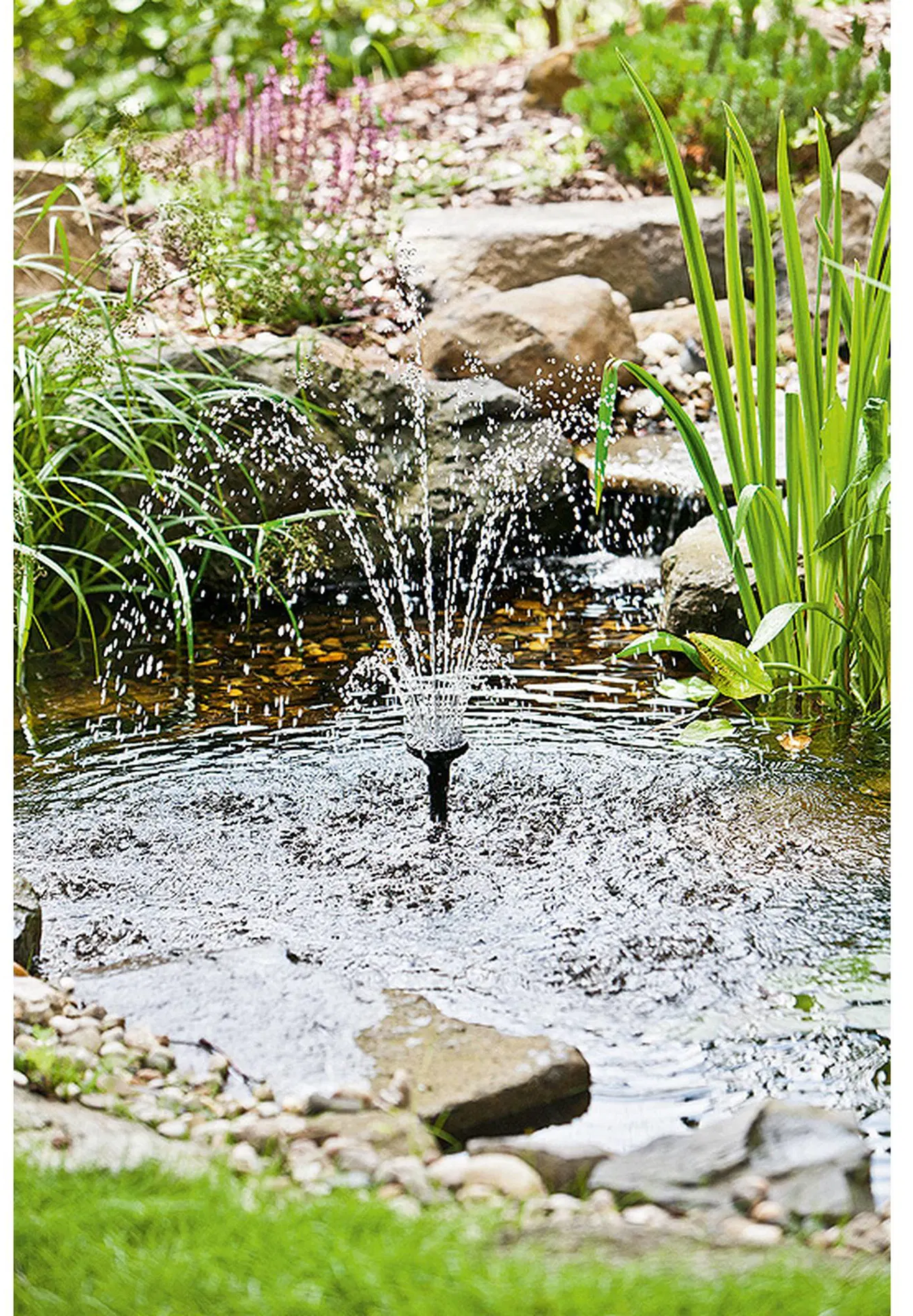 This HEISSNER solar-powered pond pump allows you to put up decorative water features without the need for an external power connection. It is ideal for mini ponds, patio ponds, water bowls or raised ponds. The system operates exclusively on solar energy generated via an external photovoltaic panel. The high-performance rechargeable battery ensures continuous operation even in cloudy conditions or during the evening hours. The LED ring included in the set, together with two different fountain attachments, creates an atmospheric display.