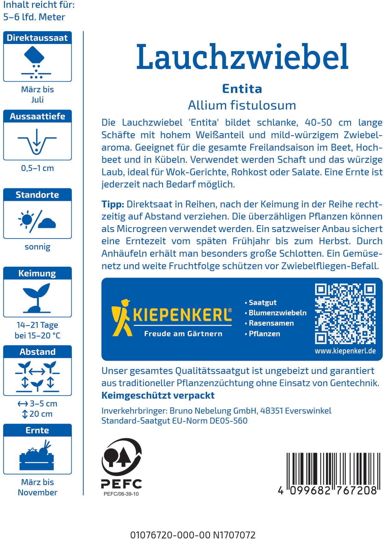 Spring onion ‘Entita’ stands out with its long, slender stems and mild yet pleasantly savoury flavour. Ideal for fresh salads, stir-fries or simply enjoyed raw straight from the garden. With its flexible harvesting window, it provides crisp, aromatic spring onions over several months – an essential addition to any kitchen and garden.