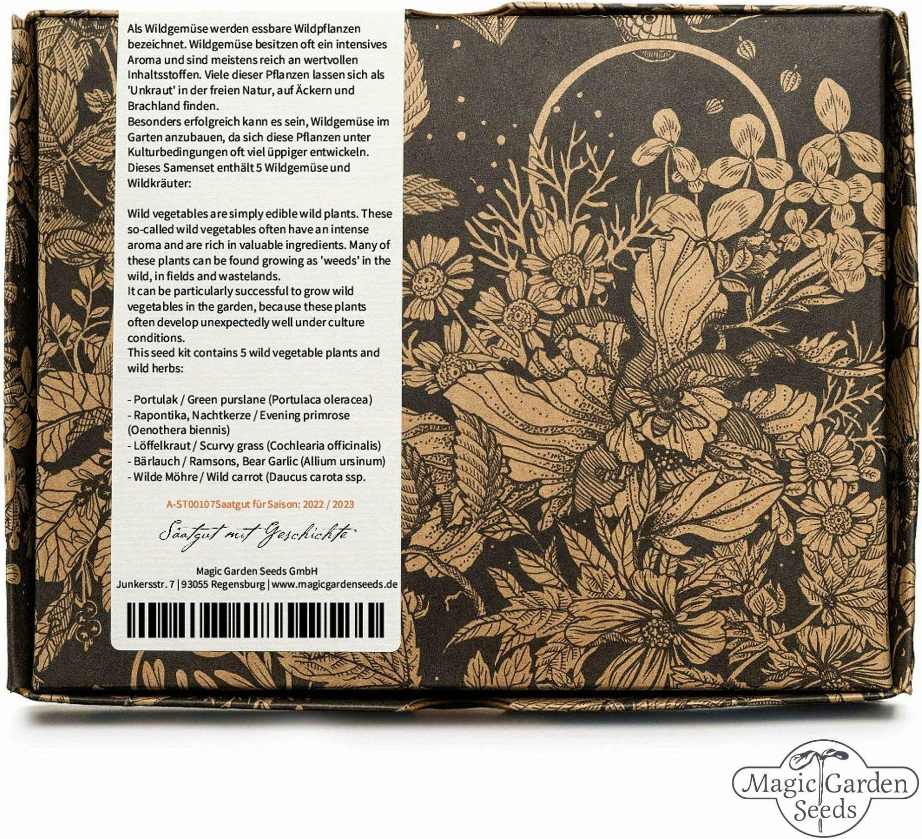 The set contains five exceptional wild vegetables and herbs for your garden. One seed packet is included for each variety. The attractive packaging also includes detailed sowing instructions in both German and English.