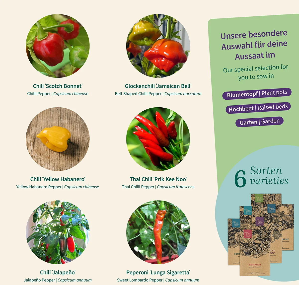 This seed set covers the entire flavour spectrum of chillies, from aromatic and mild to intensely spicy. The seeds are suitable for growing in the garden, raised beds, and containers, and are a must for all chilli lovers.