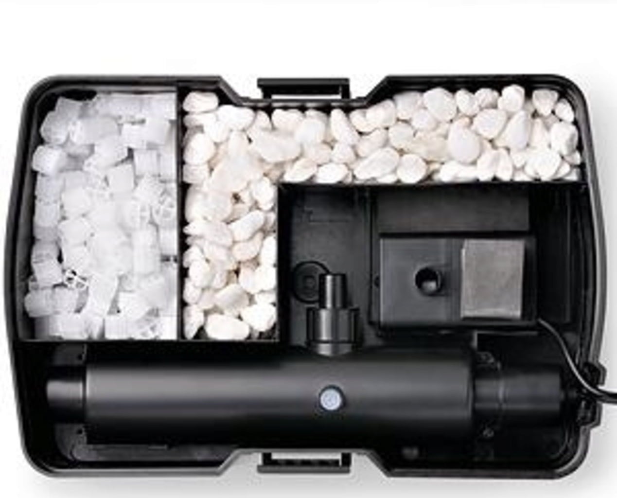 The PondoRell 1500 UVC Solar by Oase is a compact underwater filter for ponds with a UVC output of 5 W. It has a three-stage mechanical cleaning technology which eliminates bacteria, germs and floating algae. It is powered by solar energy to save on energy costs but can also be connected to the mains with the power supply unit to turn it on in case it's cloudy.