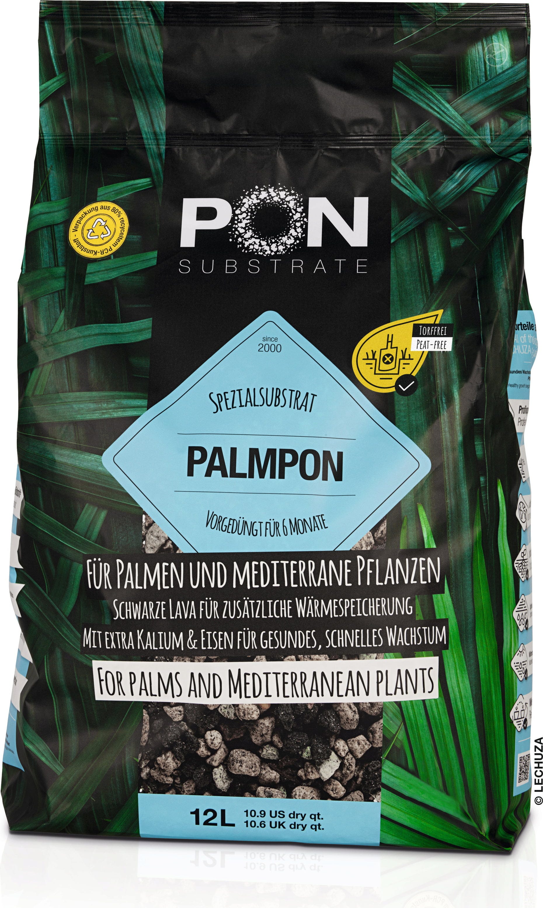 Do you love your palm trees and want them to develop lush, green leaves and strong growth? Palmpon provides the ideal environment for tropical plants. The special blend with black lava retains valuable warmth and recreates the natural conditions that plants thrive in. With added potassium and iron, palms grow healthily and vigorously. Best of all, the slow-release fertiliser supplies plants with nutrients for the first 6 to 8 months without any effort on your part.
