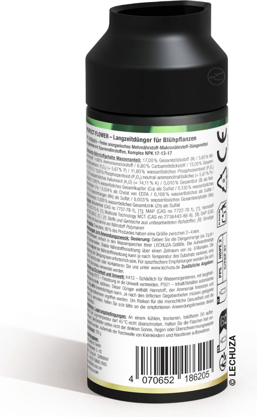 Lush blooms are the result of a precise supply of nutrients. Perfect Flower relies on the long-term formula, which releases micronutrients over a period of 6 to 8 months. With the practical dosing cap, you can now completely avoid fertiliser errors.
