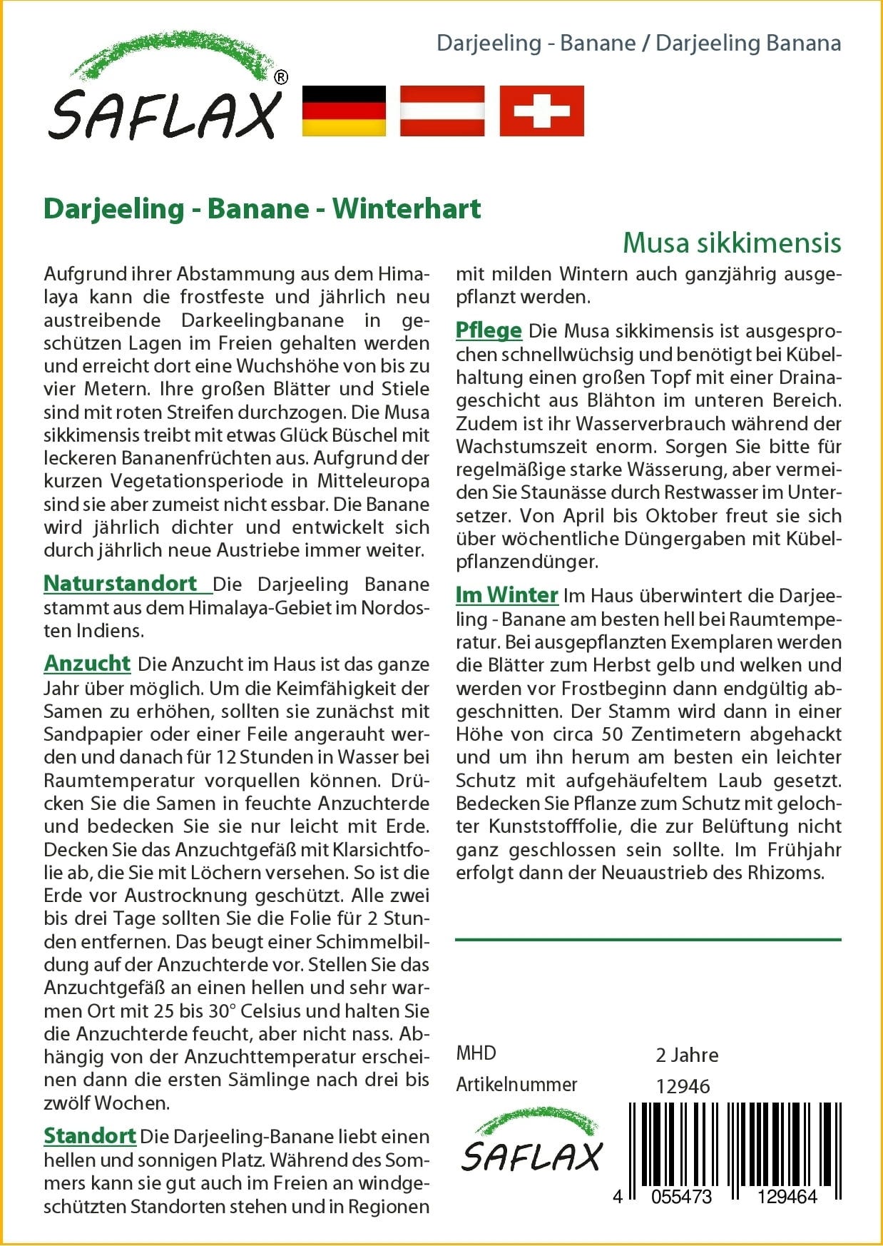 The Darjeeling banana originates from the Himalayan region and is therefore quite winter hardy in areas with mild winters. If cultivating in a pot, choose a container that is large enough as this plants grows very quickly.
