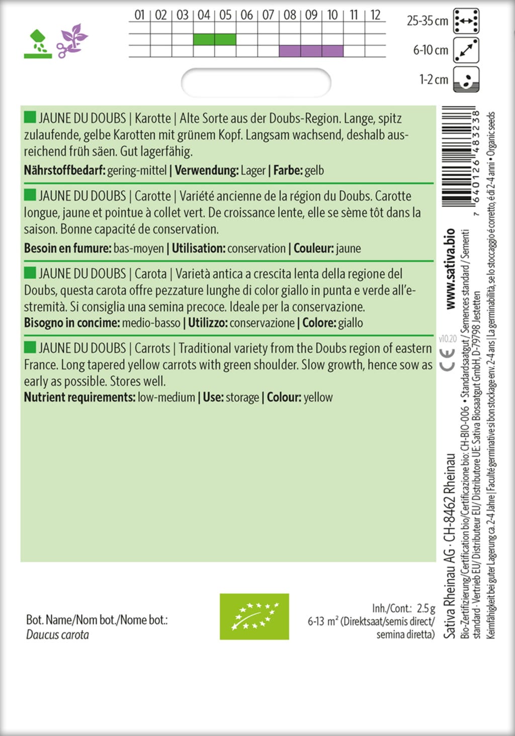 This heirloom variety, originating from the Doubs region, produces long, yellow, tapered carrots with a green top that store well. Since they grow slowly, they should be sown quite early.