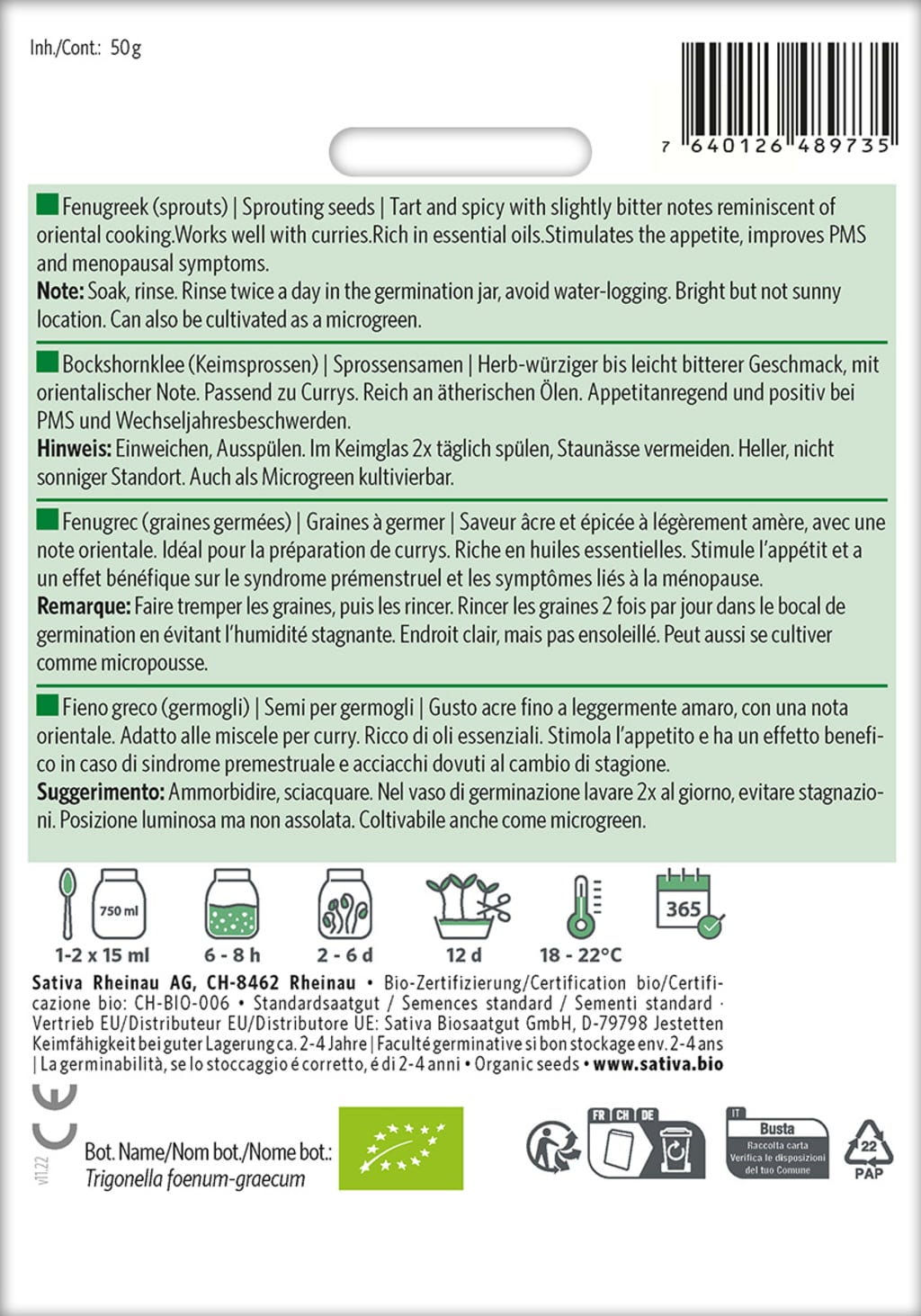Fenugreek sprouts have a tart, spicy to slightly bitter flavor. With their oriental note, they are the ideal ingredient for curries. Depending on your preference, the seeds can also be cultivated as microgreens.