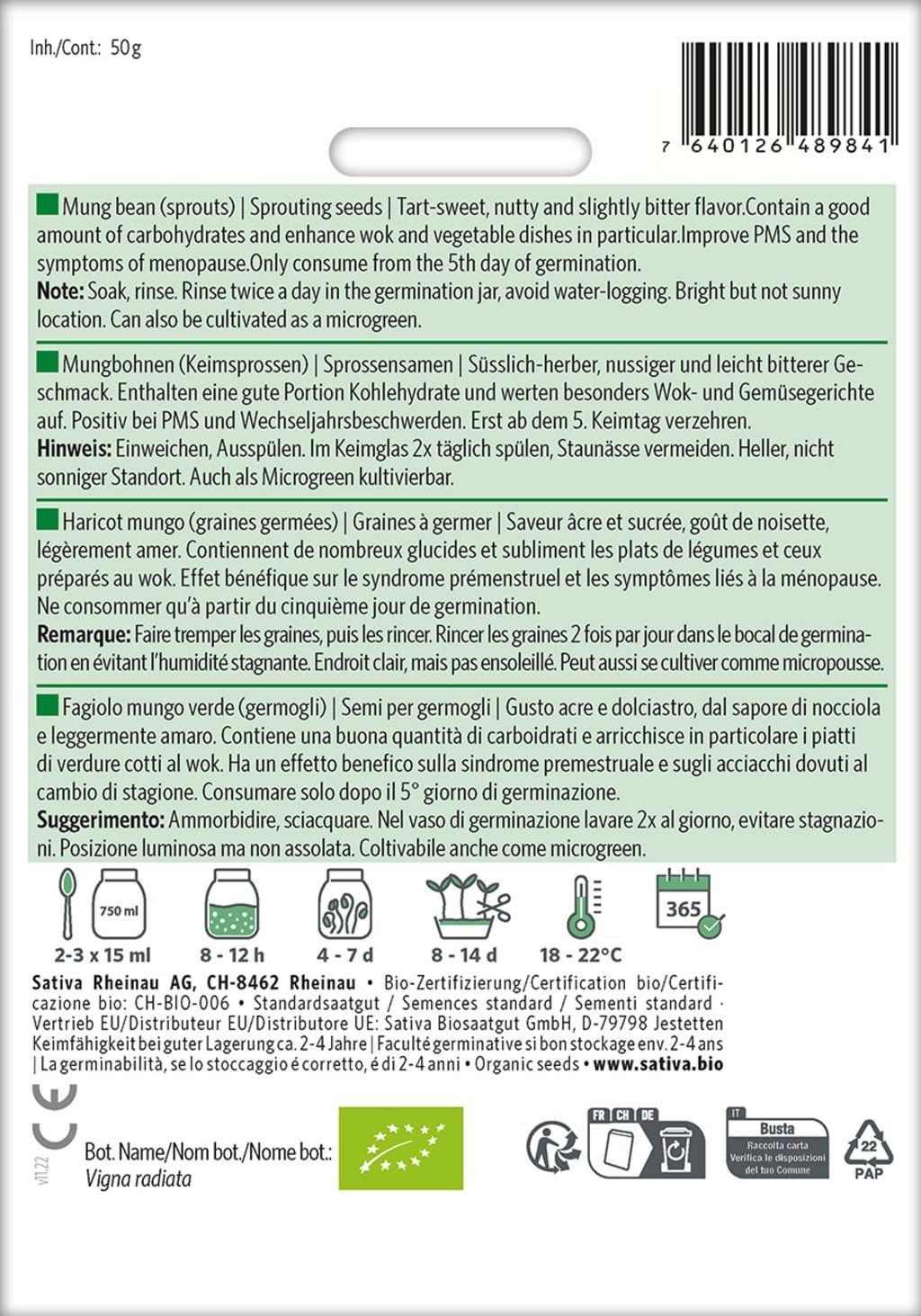 Mung bean sprouts have a sweet-tart aroma. Their flavour is nutty and slightly bitter. They harmonise wonderfully with wok and vegetable dishes. The sprouts should only be consumed from the 5th day of germination. Cultivation as microgreens is also possible.