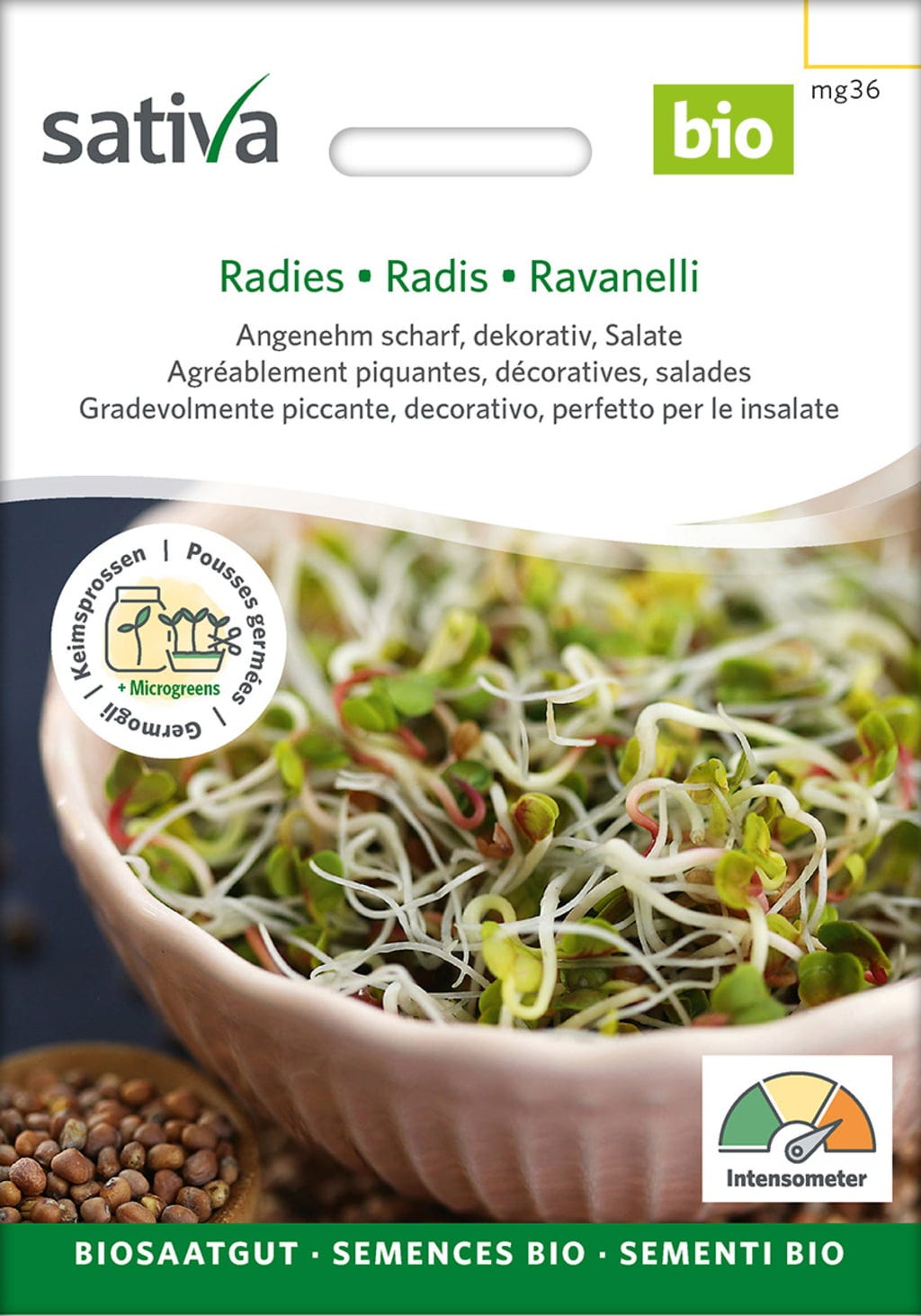 The tender radish sprouts have a pleasant spiciness, which decreases with a longer germination time. With their purple roots and green leaves, they add colorful accents. They harmonize perfectly with vegetable dishes, dips, salads, and soups.