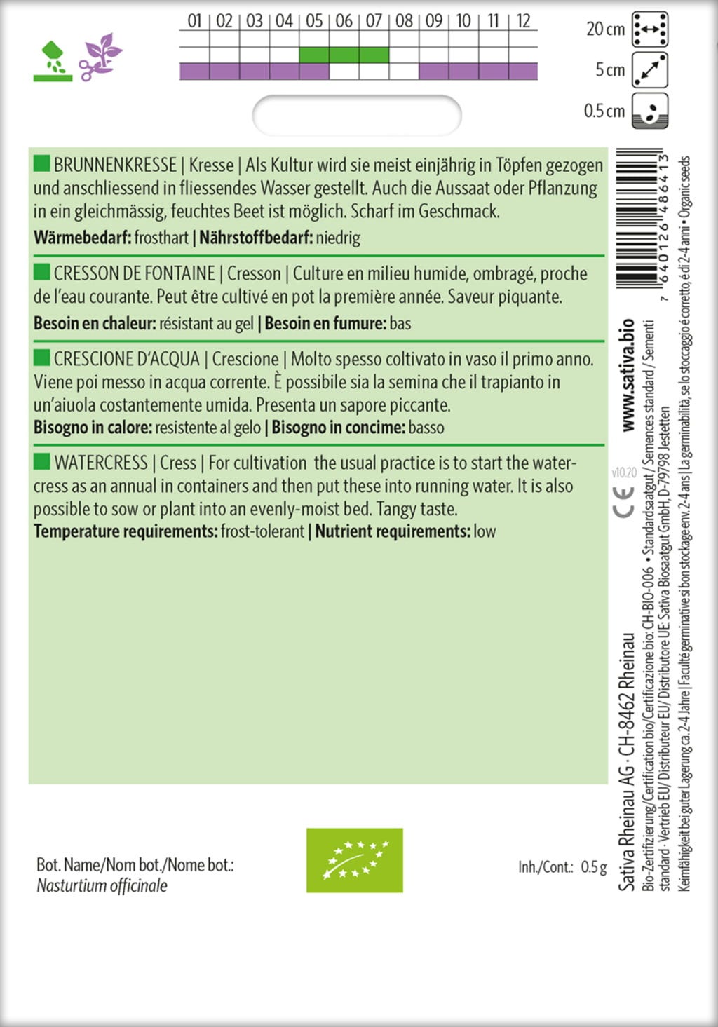 Watercress can be planted in both evenly moist garden beds and pots. Its sharp flavor adds a wonderfully spicy note to salads, soups, and many other dishes.