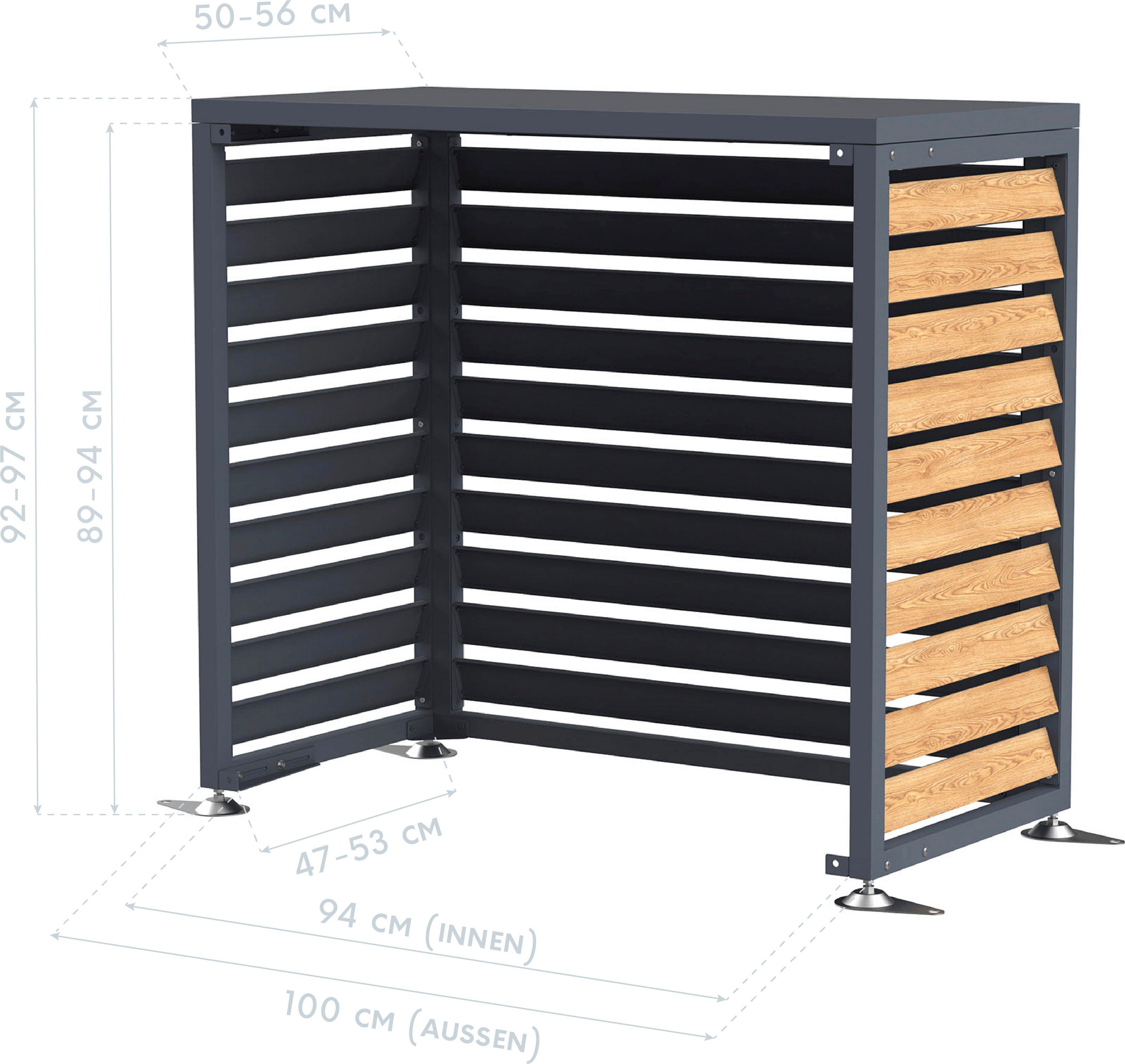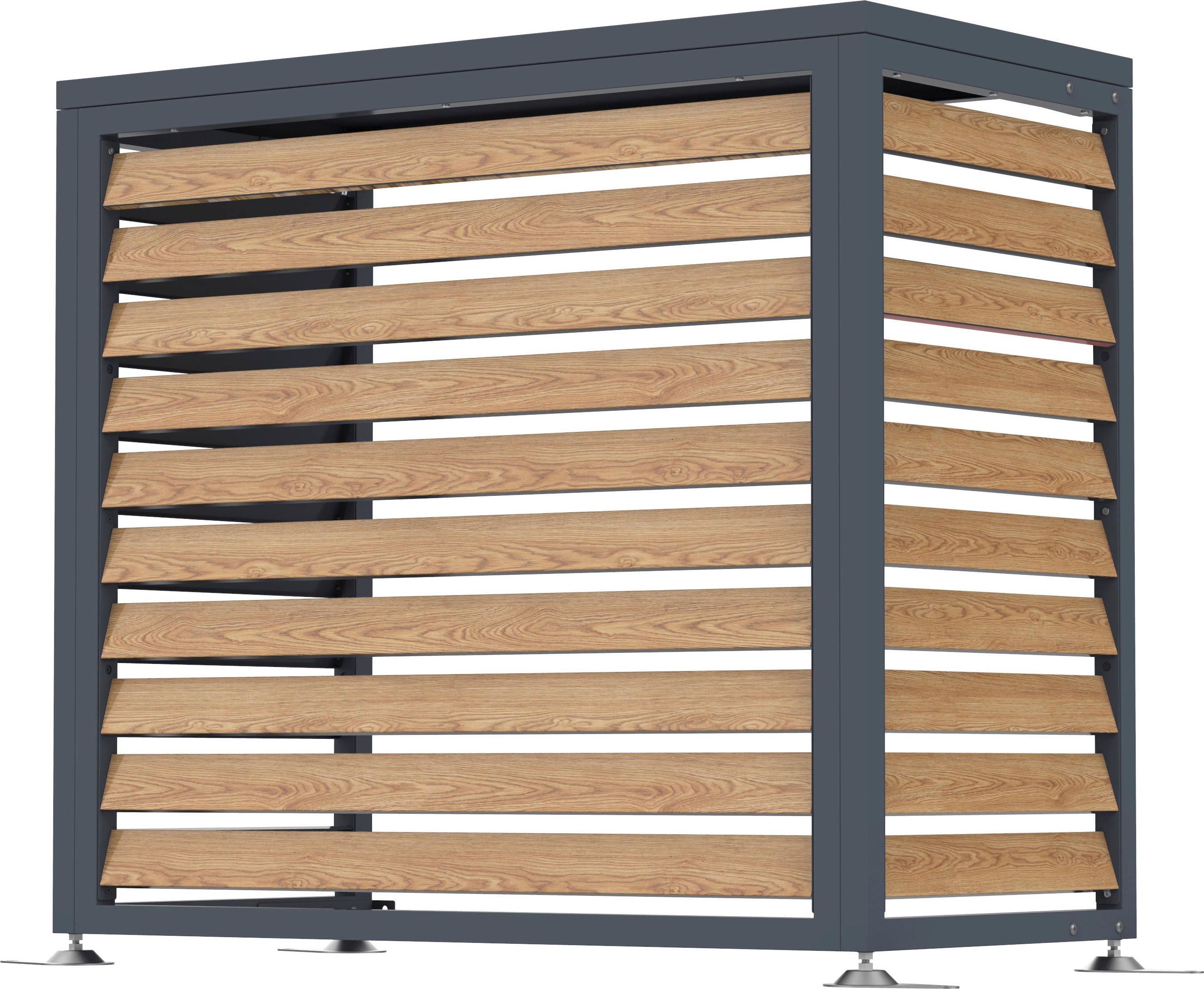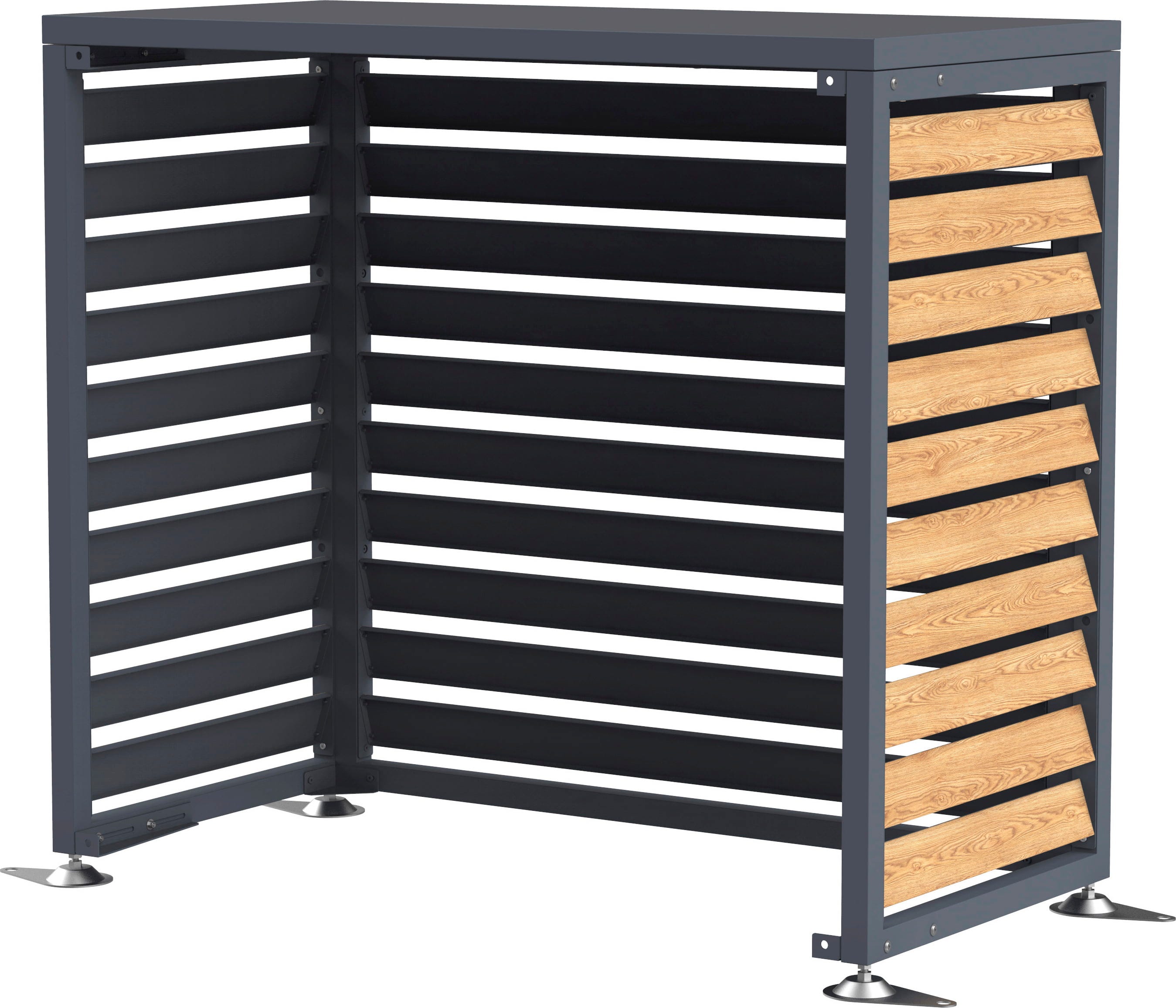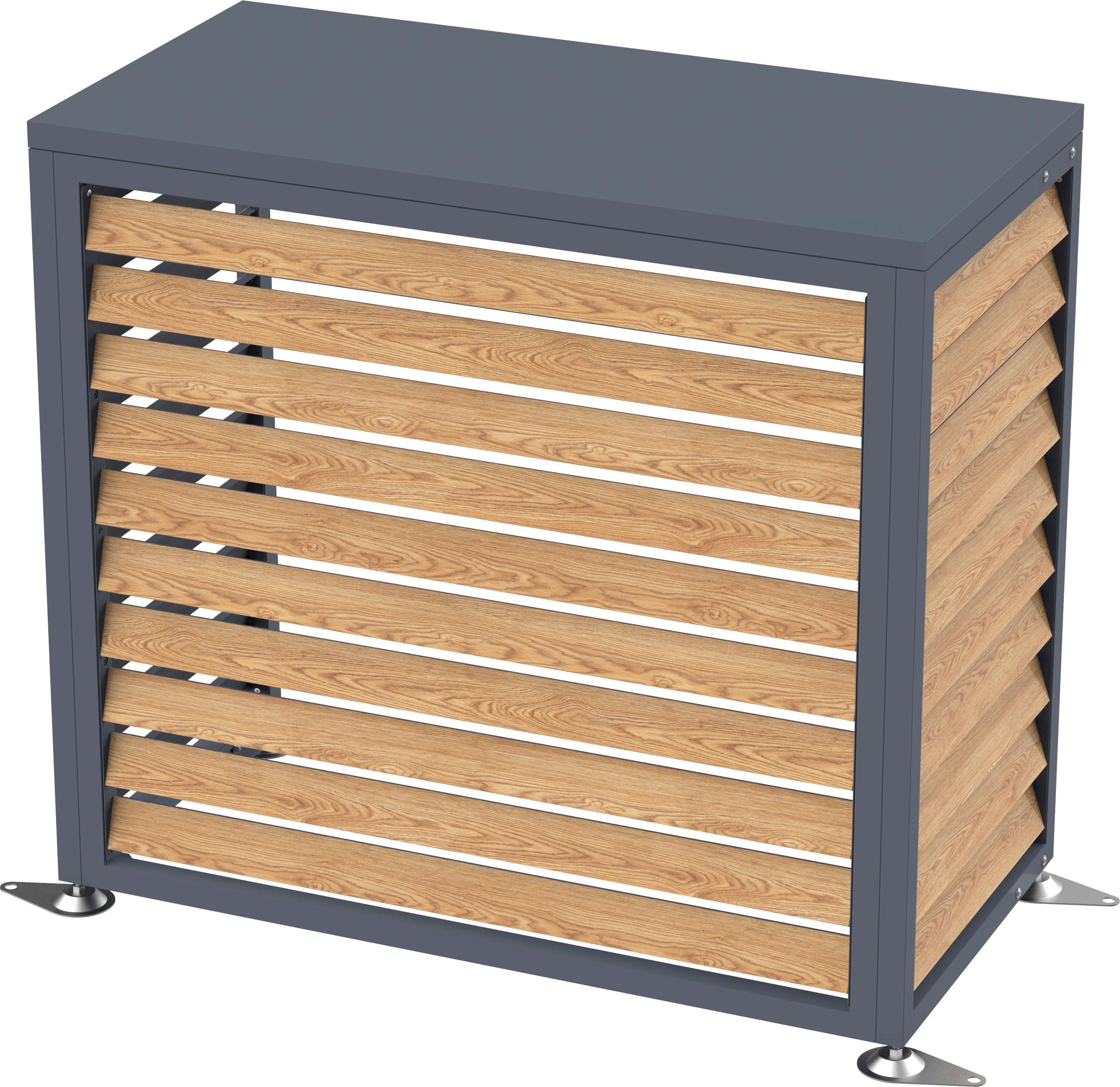 The Boxa enclosure, made of powder-coated steel, impresses with its decorative wood-effect and protective properties. It provides a visual upgrade for air conditioning units and heat pumps while reliably shielding them from the elements.