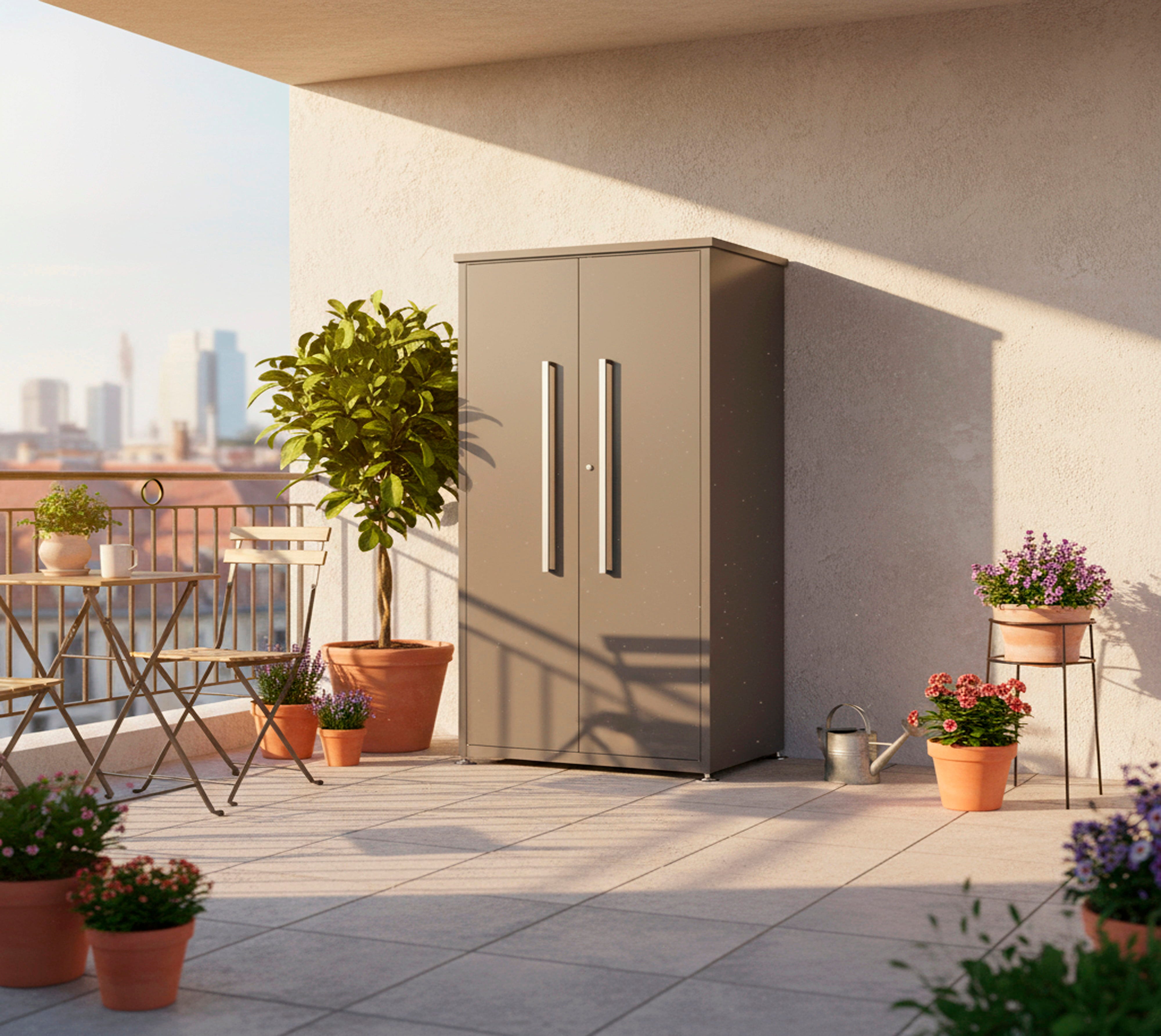 The Capsa Garden Cabinet combines contemporary design with maximum storage capacity. A true marvel of space efficiency, this powder-coated steel cabinet is the perfect choice to organise and store your garden tools. Robust and designed for all-weather use, it is perfect for outdoor areas, while the wide, lockable double doors provide easy access for storing bulky equipment and gardening essentials.